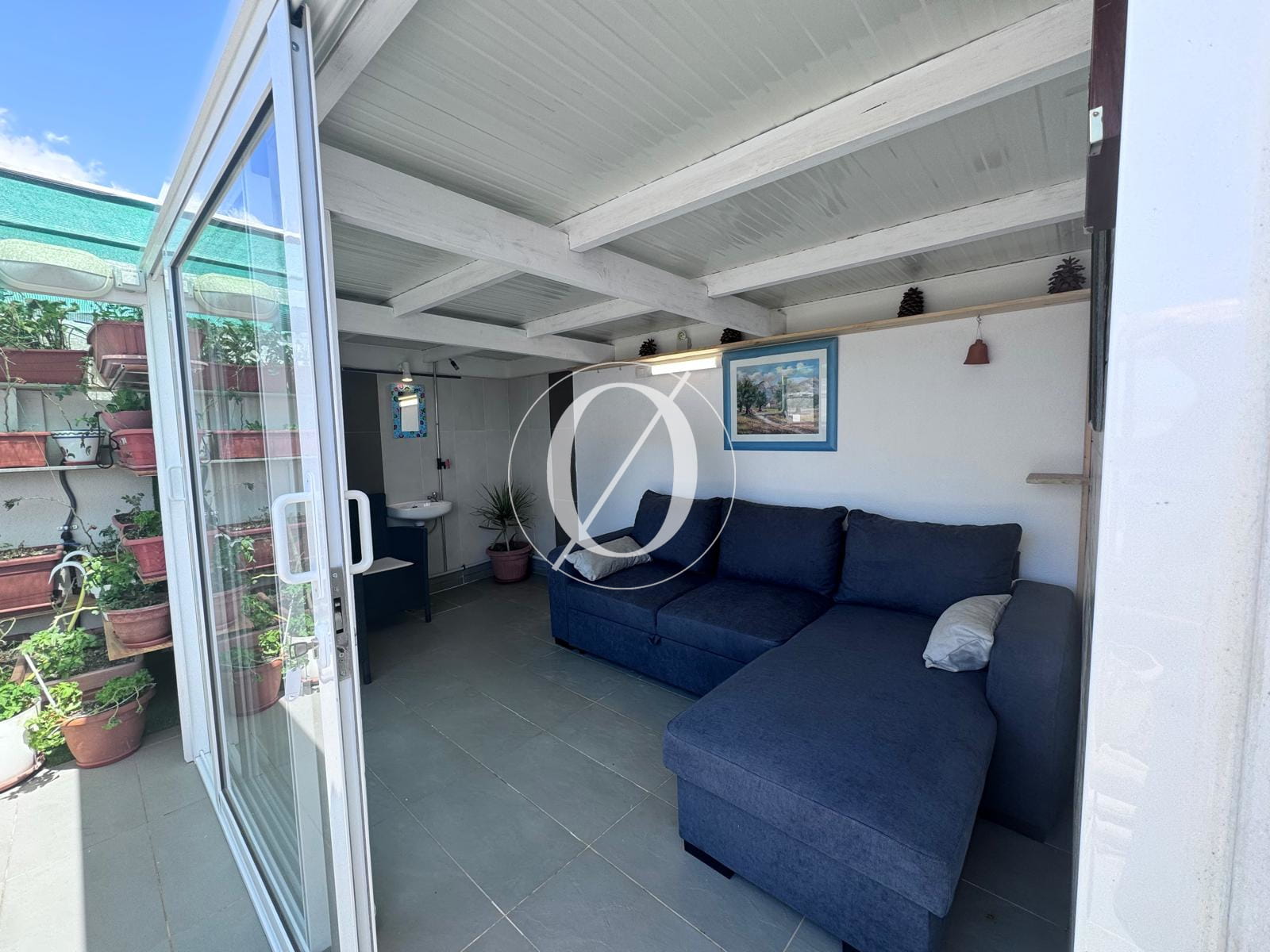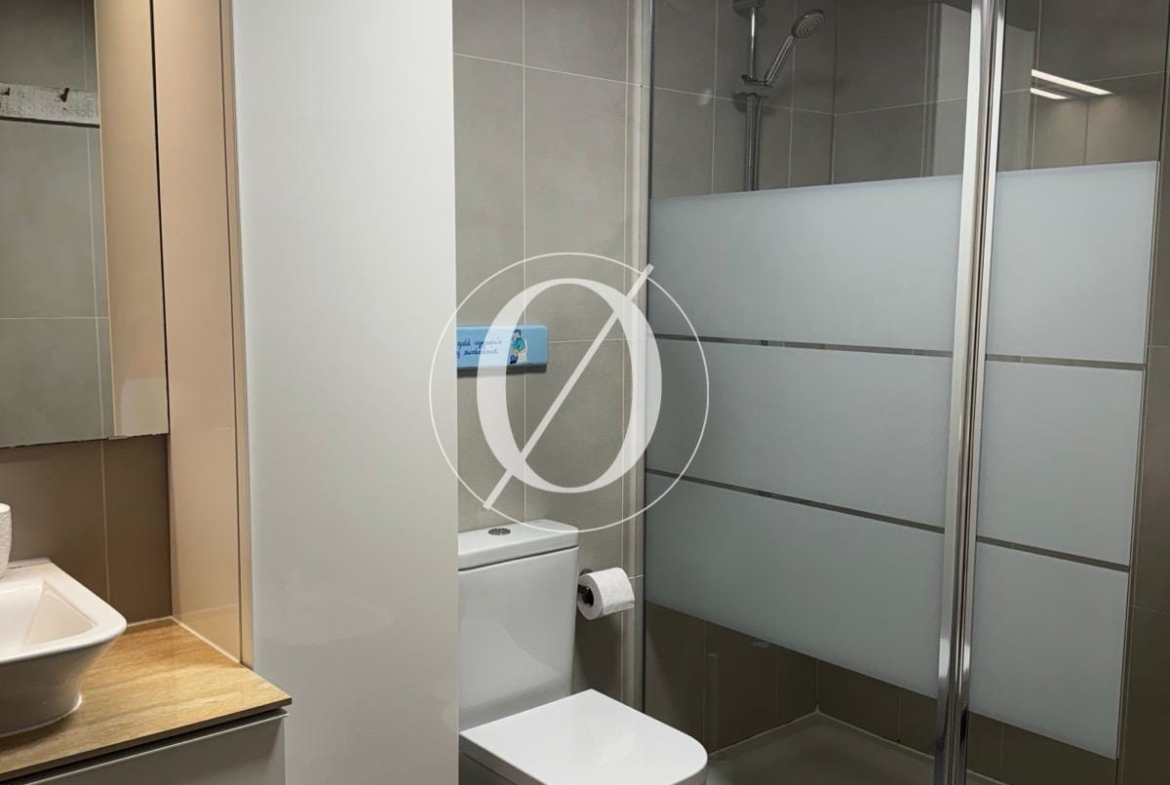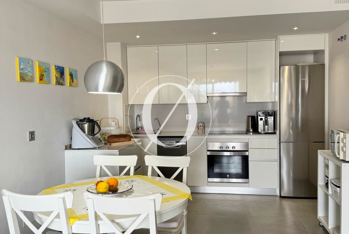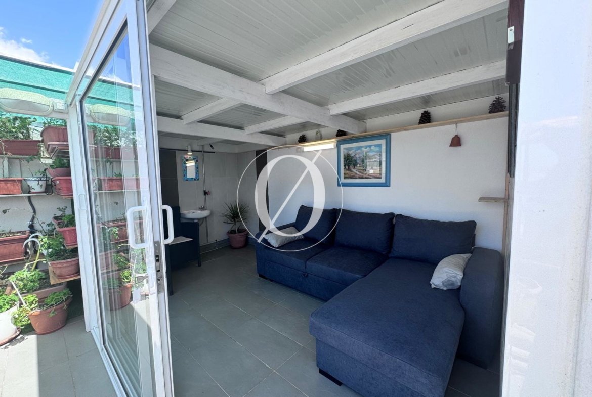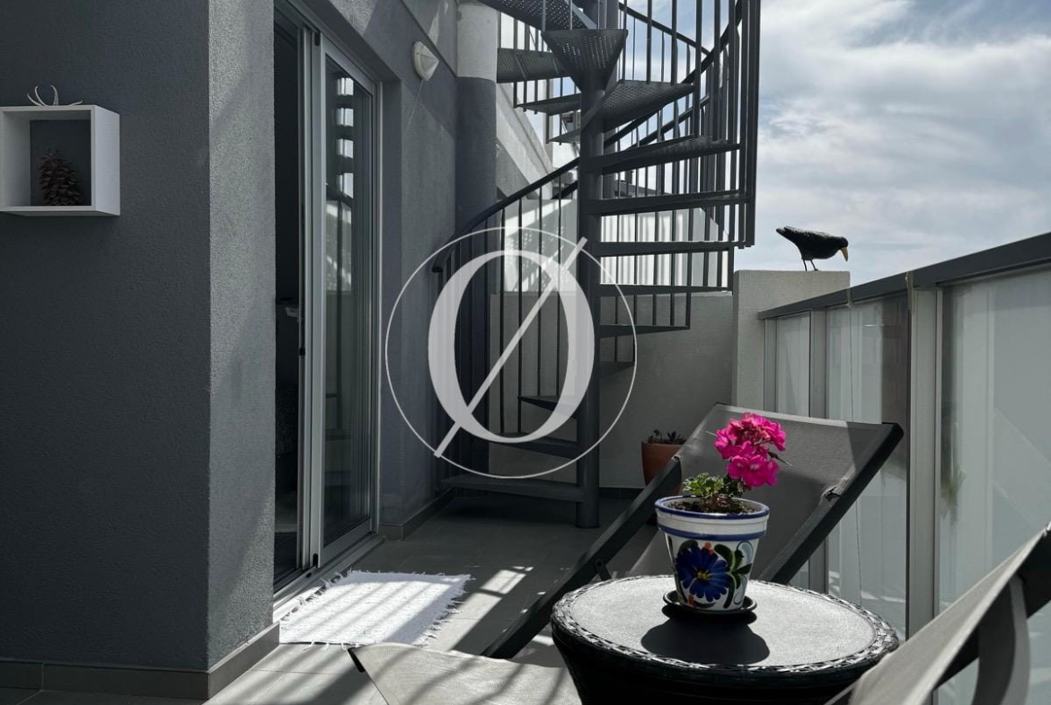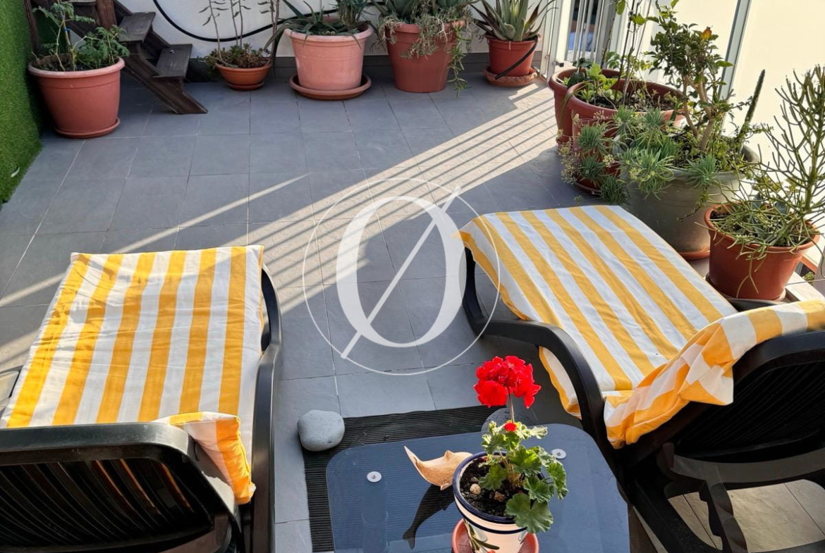 Spanning 115 m², the apartment features a spacious living room with an open-plan kitchen and a bedroom opening onto a 15 m² balcony, which provides stairs leading down to a 30 m² private garden terrace. On the upper level, where the large terrace is located, there is a second spacious room with a shower room. This versatile space can be used as a guest bedroom, home office, or additional living area.